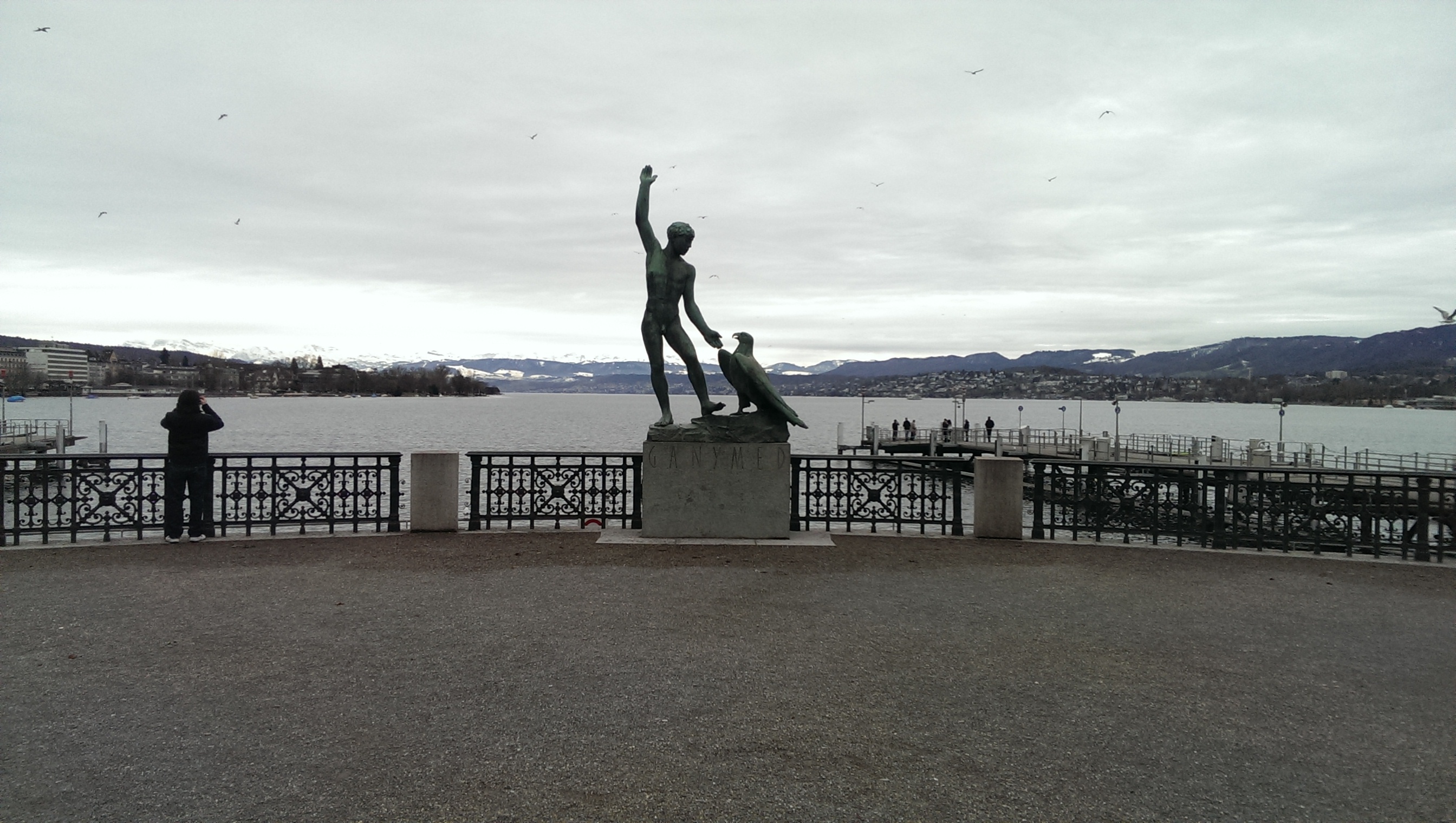 Bürkli Platz’a, gölün kenarına geldiğimizde biraz durup arkadaki Alplerle gölün muhteşem manzarasını resimliyoruz. Sağa dönüp gölün kenarından General Guisan Quai caddesindeki parkın içinden yürüyerek, kazların ördeklerin resimlerini çek çeke Quai 16’ya geliyoruz. Yazın çok eğlenceli, göle girilebilen bir alanının olduğu bu şeker kafe/ restaurant kışın kapalı.