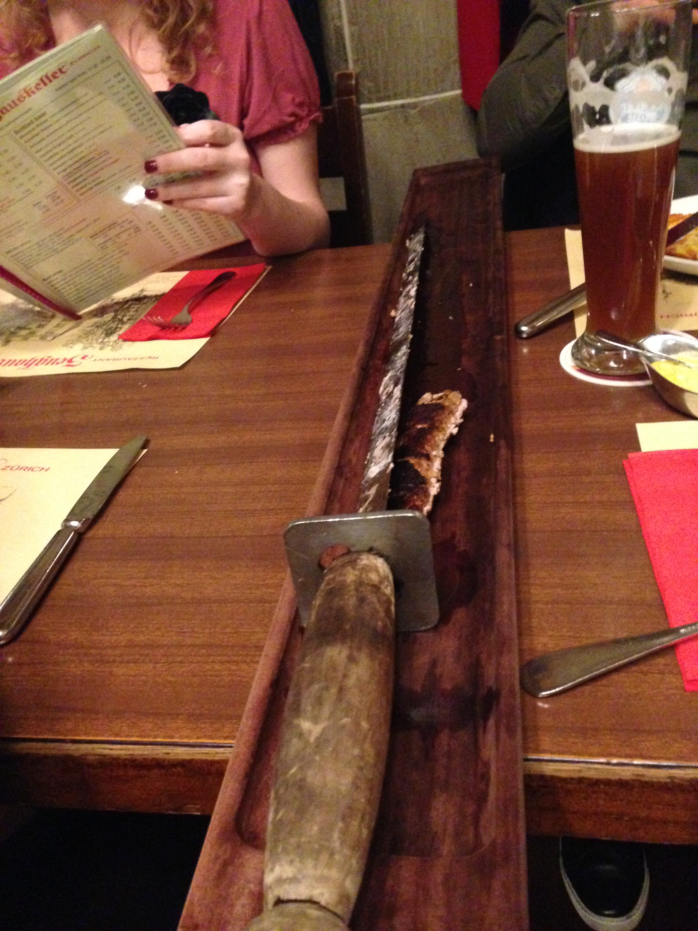 Ayrıca lokal reastaurant Zeughauskeller de mutlaka denenmeli. Buranın özel yemeği Burgermaister Schwert (süt danasından yapılıyormuş), 2 kişilik olduğundan fiyatı menüdeki diğer yemeklerden biraz daha pahalı, ama gerek sunumu (bir masa boyundaki kılıçla servis ediliyor) gereke tadıyla yenmesi gereken bir yemek. Yanına patates kızartması, salata ve rosti çeşitlerinden birini seçiyorsunuz. Rosti rendelenmiş patates kızartması. Burgermaister Schwert yemeyeceğiz biz, başka yemek yiyeceğiz derseniz de mutlaka yanında “rosti” ile yiyin.